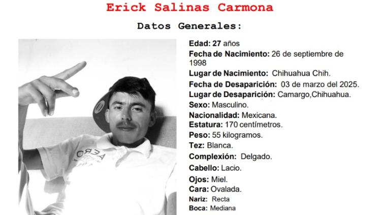 Erick Salinas Carmona de 27 años, desapareció hace dos semanas en Camargo, Chihuahua. Desde ese día su familia no sabe nada de él y por ello piden ayuda a la ciudadanía para localizarlo sano y salvo.