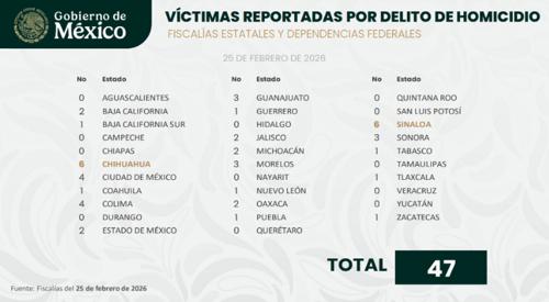 Específicamente, el reporte correspondiente al 25 de febrero contabiliza a nivel nacional 47 víctimas por delito de homicidio.
